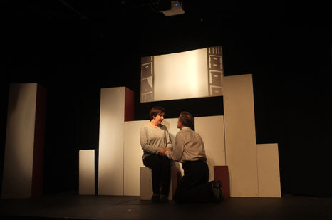 For this play I made a series of cardboard cutout backdrops as well as many shadow puppets for different scenes. These included figures based on specific actors' characters, items like the house and the table cloth, a ballerina, some pedestrians in the rain and some paper lanterns. I also made a paper-mache kidney shaped lamp prop.
